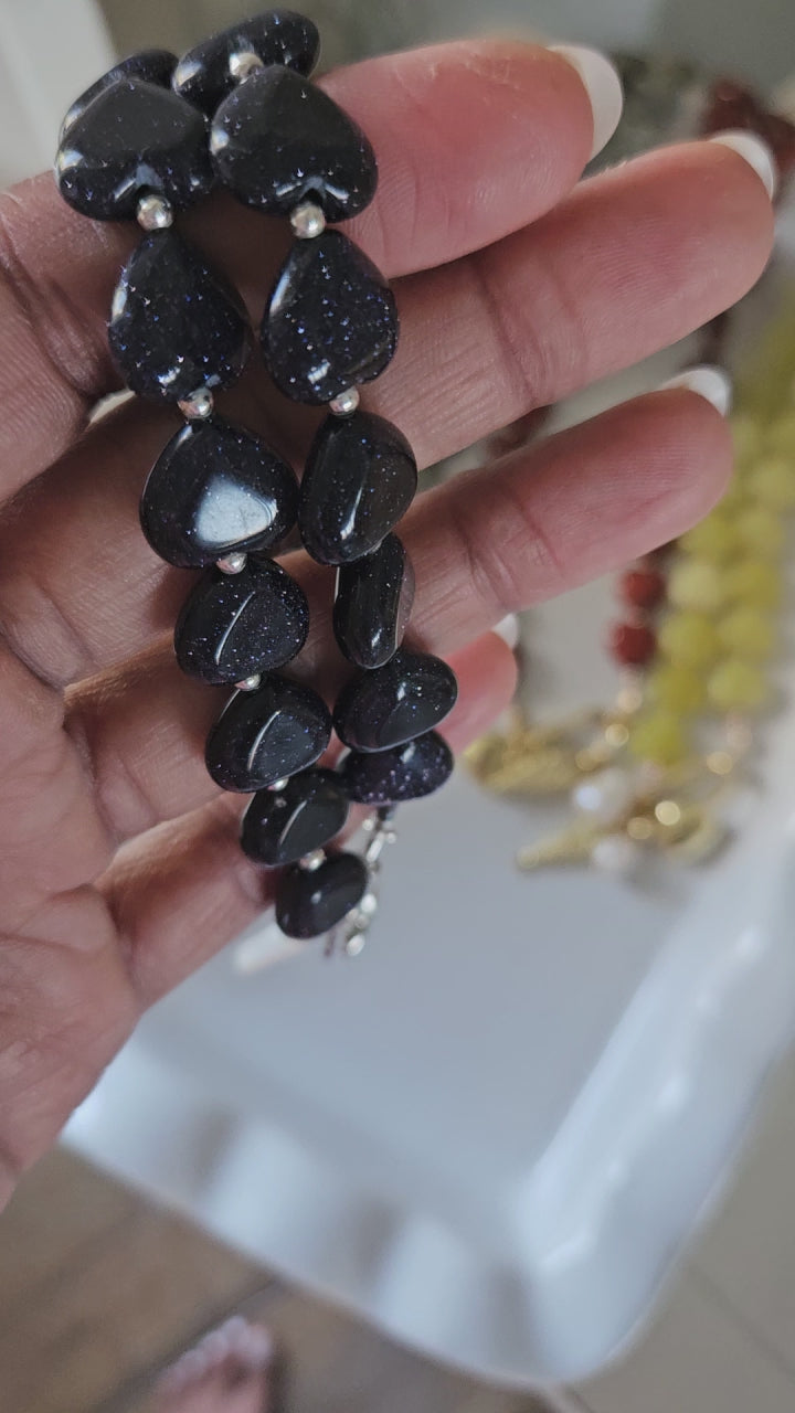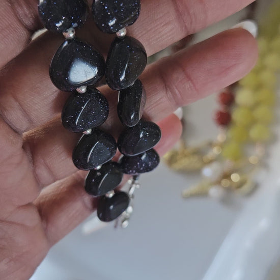 This stunning 16.5 inch necklace is the perfect addition to your fall wardrobe. The deep navy blue color, adorned with galaxy sparkles and a silver carabiner pendant, adds a touch of elegance to any outfit. Complete with a clasp in the back for easy wear. Perfect for pairing with neutral tones and fall fashion.